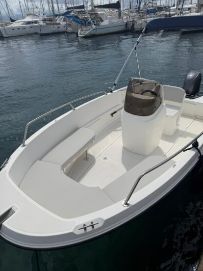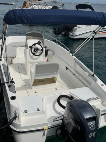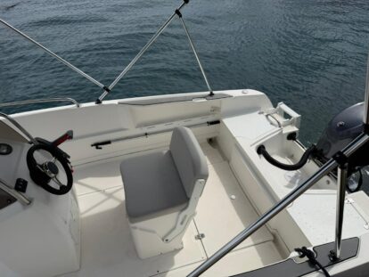 Équipé de banquettes coffres et d'un porte canne, d'une échelle de bain et d'un bimini de protection solaire, sa carène lui offre de belles qualités de stabilité en mer.